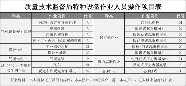 叉車(chē)證-全國(guó)叉車(chē)上牌,電梯維修,特種安全設(shè)備管理,起重機(jī)指揮,起重司機(jī)(限門(mén)座式起重機(jī)),起重司機(jī)(限橋式起重機(jī)),起重司機(jī)(限門(mén)式起重機(jī)),起重司機(jī)(限纜索式起重機(jī)),起重司機(jī)(限塔式起重機(jī))起重司機(jī)(限流動(dòng)式起重機(jī))起重司機(jī)(限升降機(jī)),觀光和觀光列出司機(jī),鍋爐壓力容器壓力管道管理,電梯管理,起重機(jī)械管理,場(chǎng)(廠(chǎng))內(nèi)專(zhuān)用機(jī)動(dòng)車(chē)輛管理,工業(yè)鍋爐司爐,電站鍋爐司爐,鍋爐水處理,快開(kāi)門(mén)式壓力容器操作,移動(dòng)式壓力容器充裝,氣瓶充裝,金屬焊接操作-壓力焊PE焊,非金屬焊接操作-壓力容器焊,食品檢驗(yàn)員,化學(xué)檢驗(yàn)員,農(nóng)產(chǎn)品檢驗(yàn)員(4年一審,需要到期前3個(gè)月進(jìn)行)
